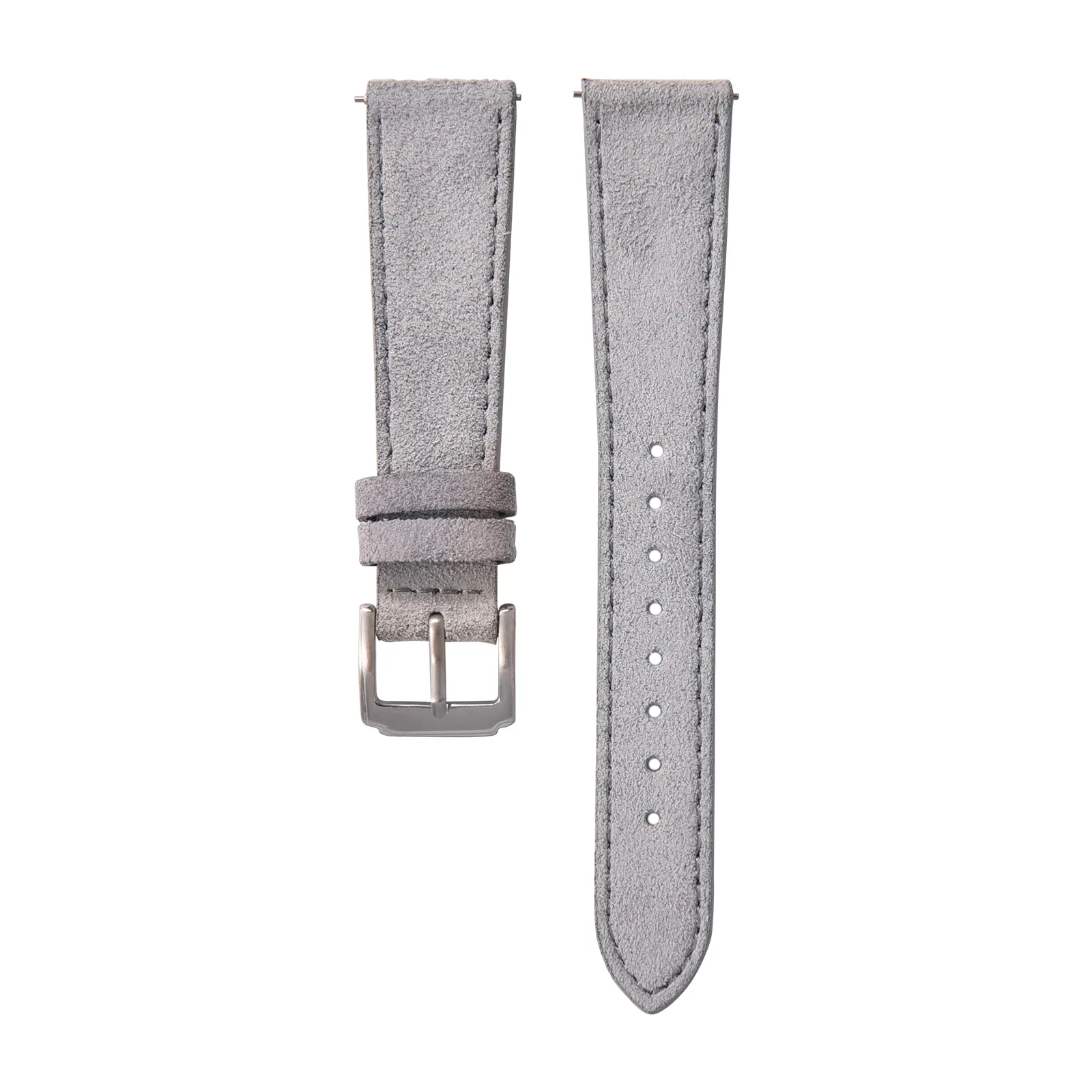 Grey Suede Band with a Silver Brushed Buckle from CHROONOO. This replacement watch band is manufactured from Cowhide Leather and is available in 8 colors and 4 lug widths.