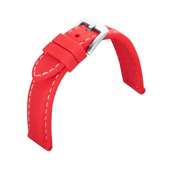 Red Silicone Strap with a Silver Brushed Buckle by Eulit. This replacement watch band is made out of Silicone and is available in 5 colors and 4 lug widths.