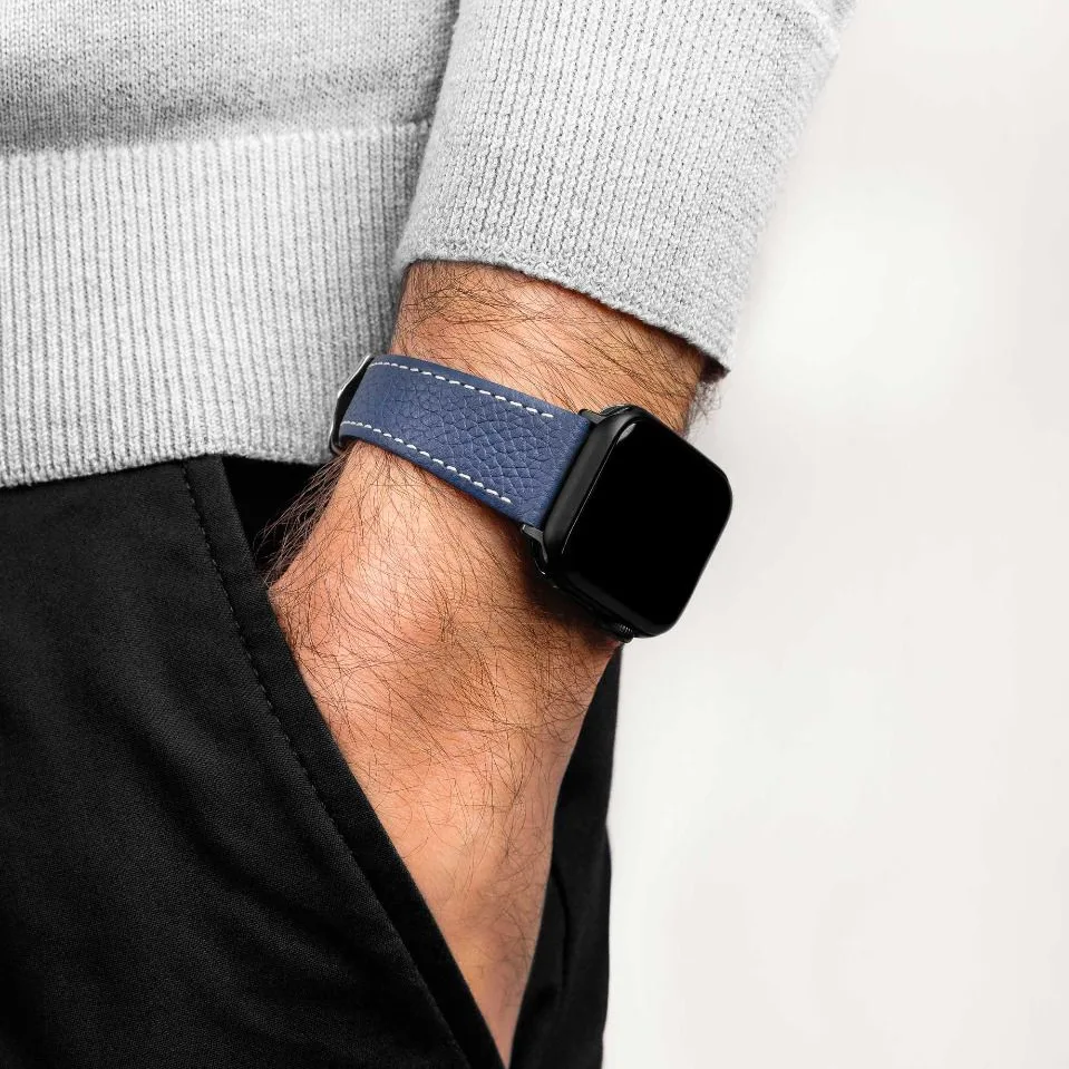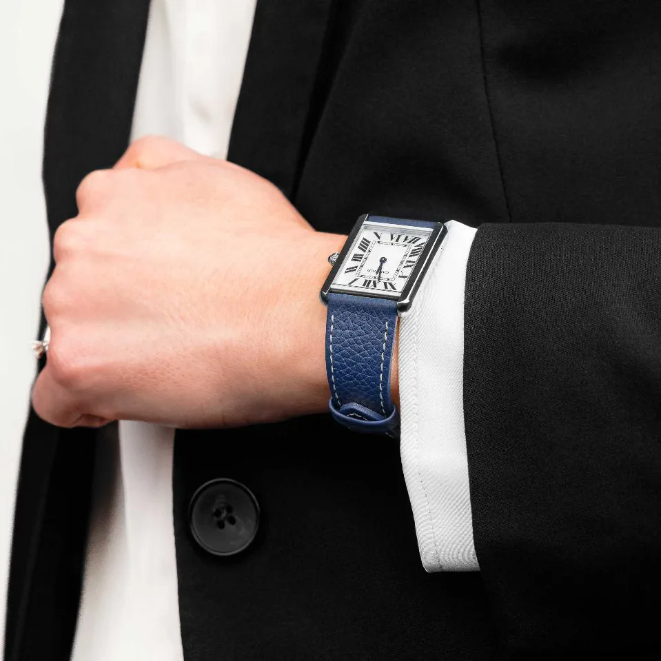 Blue Classic Watch Strap with a Silver Polished Buckle from HIRSCH. This replacement watch band is manufactured from Barrel-Dyed Calfskin and is available in 8 colors and 18 mm, 19 mm and 20 mm lug widths.