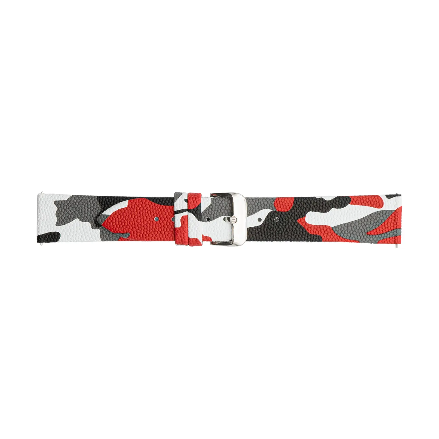 Red Camouflage Watch Strap with a Silver Buckle from Pebro. This replacement watch band is manufactured from PU and is available in 6 colors and 20 mm, 22 mm and 24 mm lug widths.