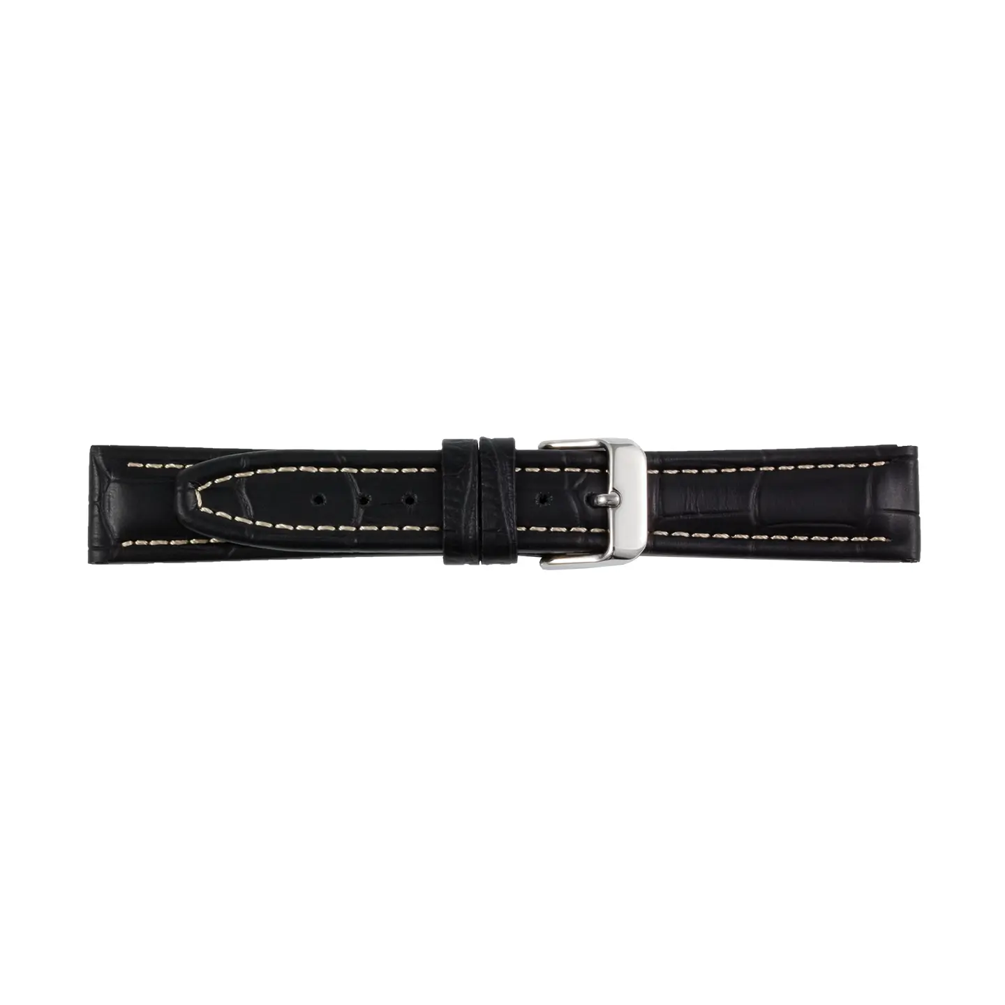 Black Crocodile Band with a Silver Buckle from Pebro. This replacement watch band is manufactured from Calfskin and is available in 3 colors and 18 mm, 20 mm and 22 mm lug widths.