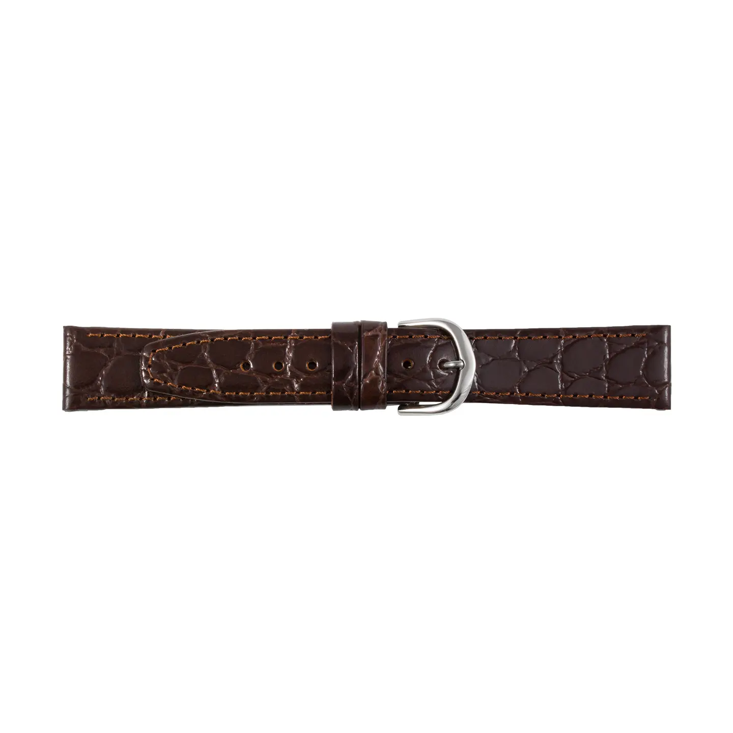 Brown Crocodile Watch Band with a Silver Buckle by Pebro. This replacement watch band is made out of Calfskin and is available in 3 colors and 6 lug widths.