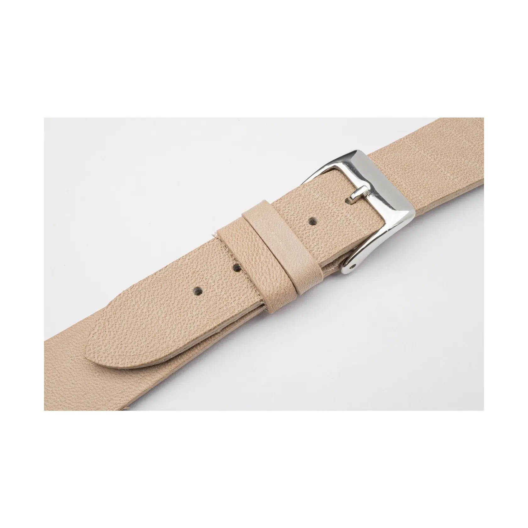 Beige Classic Band with a Silver Buckle from Pebro. This replacement watch band is manufactured from Calfskin and is available in 6 colors and 18 mm, 20 mm and 22 mm lug widths.
