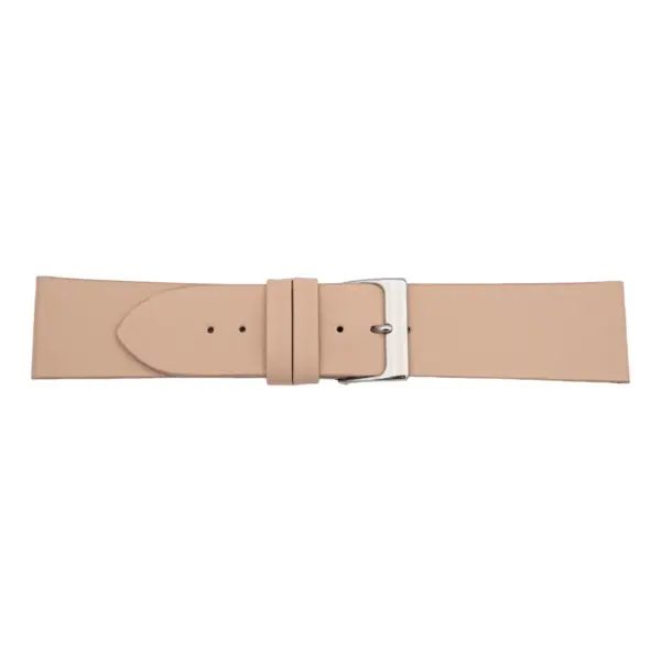 Beige Classic Watch Band with a Silver Buckle by Pebro. This replacement watch band is made out of Calfskin and is available in 17 colors and 5 lug widths.