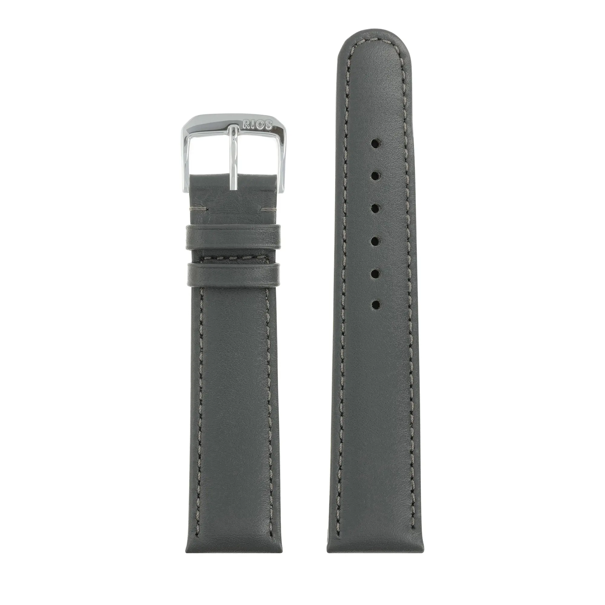Grey Saddle Leather Band with a Gold Polished or Silver Polished Buckle from RIOS1931. This replacement watch band is manufactured from Cowhide Leather and is available in 8 colors and 6 lug widths.