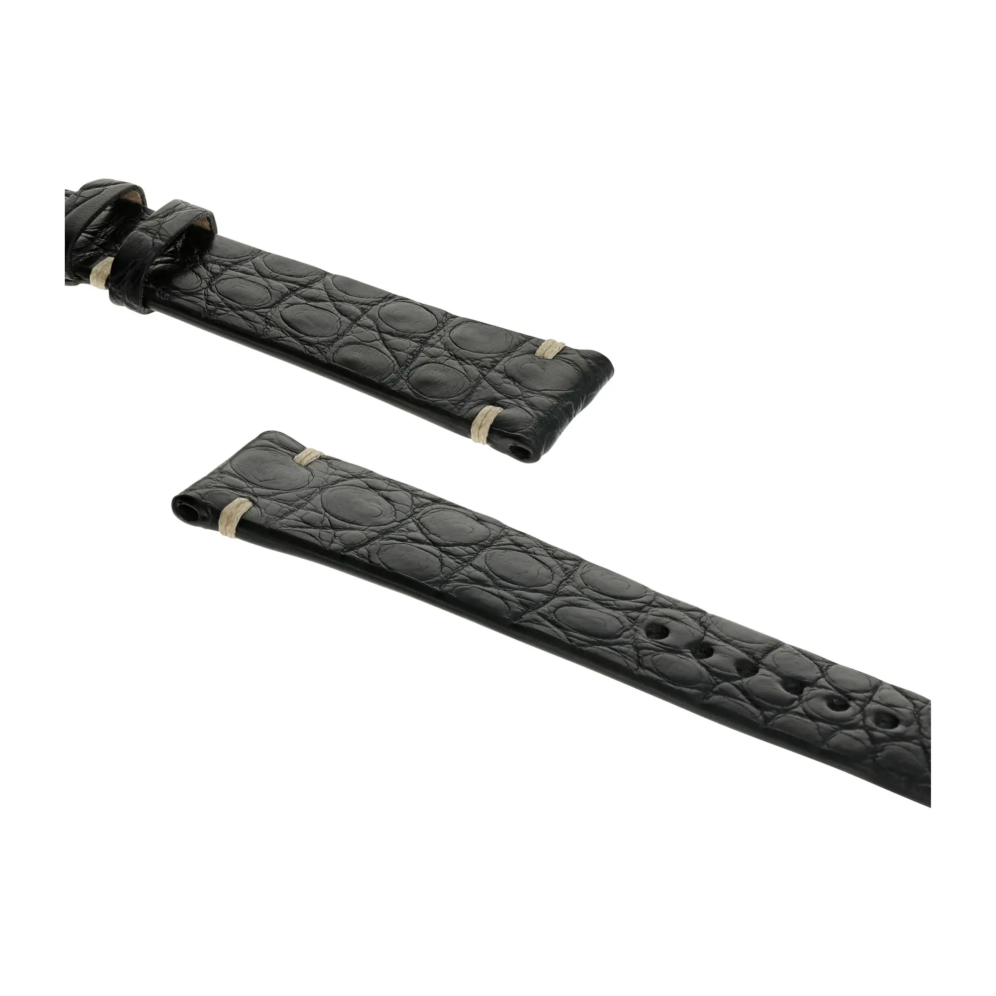 Black Crocodile Strap with a Gold Polished or Silver Polished Buckle by RIOS1931. This replacement watch band is made out of Alligator Leather and is available in 4 colors and 4 lug widths.